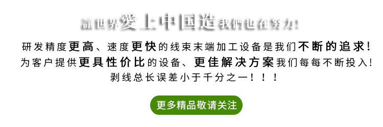专注于做线束行业优质的设备是我们持之以恒的目标,我们将一如既往,持续改进,以促进行业发展、以真诚服务客户为己任,我相信以我们二十年的机械制造与机械维护经验,可以解决您的企业在生产中的难题和困扰。