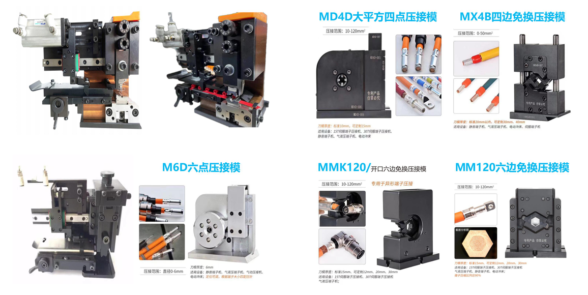 • 自主研发的产品:波纹管切断机、胶带自动缠绕机、电脑剥线机、端子压接机、剥线一体机、尼龙扎带机、电线打捆扎带机、各类压接模具、全自动裁线压接机 、全自动裁线穿防水栓压接机、全自动裁线穿号码管压接机等相关的周边设备。